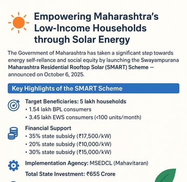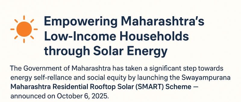 The Maharashtra State Government, in association with the Central Government and Mahavitaran, has launched the SMART Rooftop Solar Yojana to promote residential rooftop solar power systems across the state.